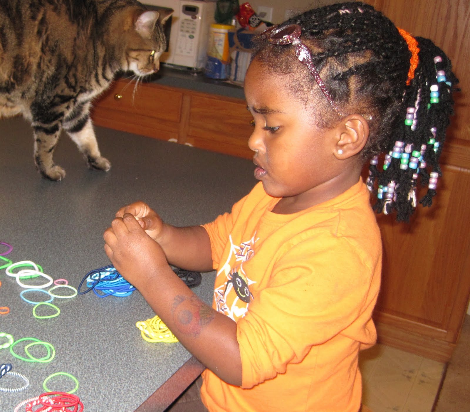 Mari was helping me organize the hair bands by colors. She did a great job sorting them and then we put them on a shower curtain ring to keep them contained.